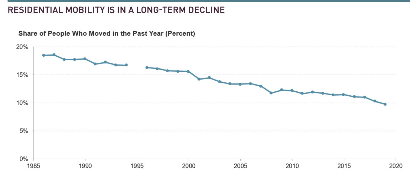 To expand on the possibilities Bill raises here, it's possible that at least some of the reasons people move less than they used to are good ones, as opposed to bad ones like unaffordable housing in NYC/LA/SF/DC/etc. Off the top of my head: good restaurants are just massively easier to find in many more places they used to be. When my wife and I used to visit her parents in Murray, KY, there was a superb "special occasion" restaurant, Freight House, we could all go to just 50 miles away, in Paducah. I bet you wouldn't have found a place of that quality in such a small town far from any urban centers 30-40 years ago. Another reason: the Internet means that you can "find your people" from afar if you have very particular or niche interests or hobbies. Still another: airline travel is much cheaper in real dollar terms, so people can live in smaller places but still afford to take trips to exciting places, which maybe takes the edge off.