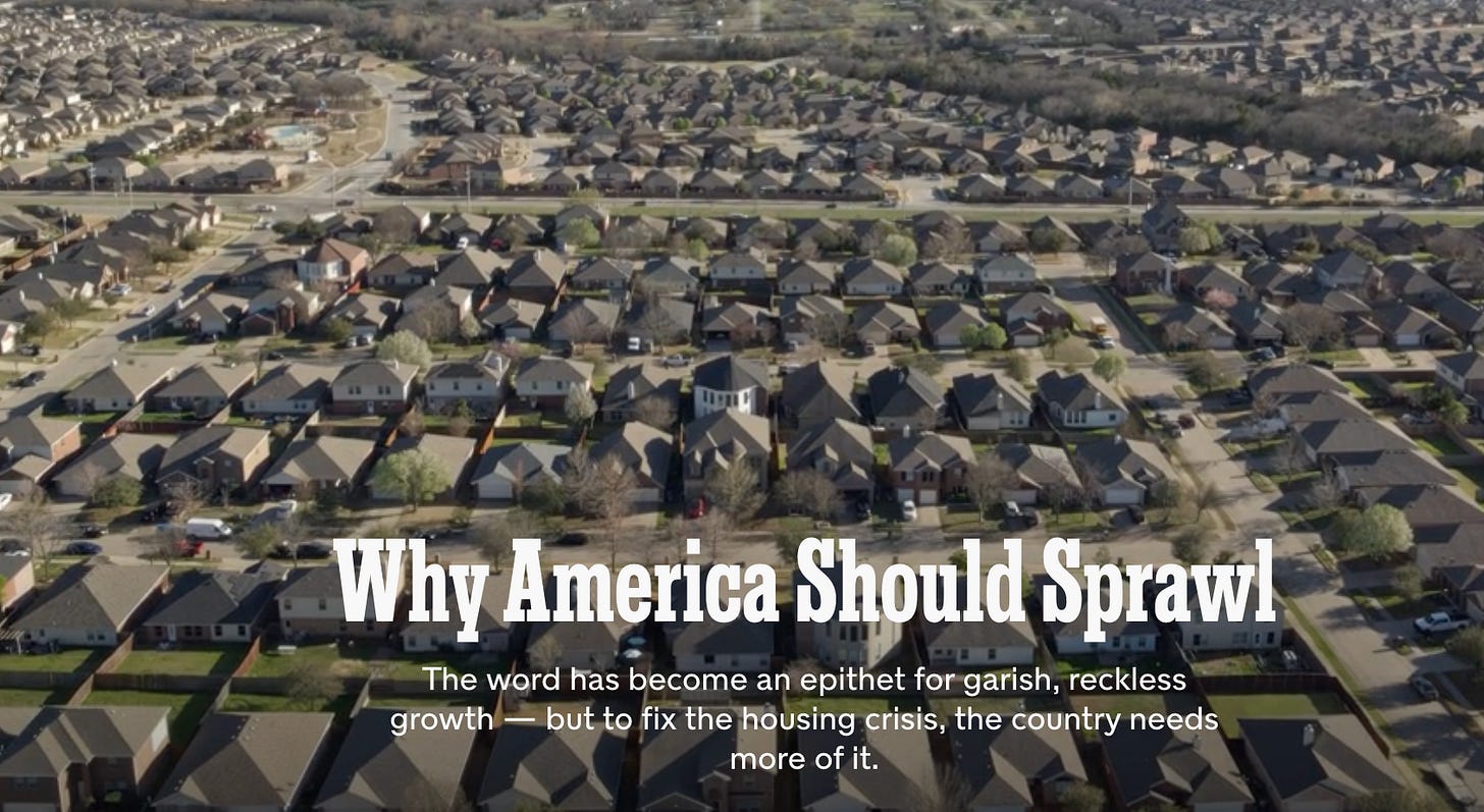 Yesterday, as I was preparing to give a speech in Fort Worth, the estimable Conor Dougherty published an article in The New York Times Magazine essentially endorsing the idea of Texas-style sprawl as part of the solution to the nation’s housing problem.